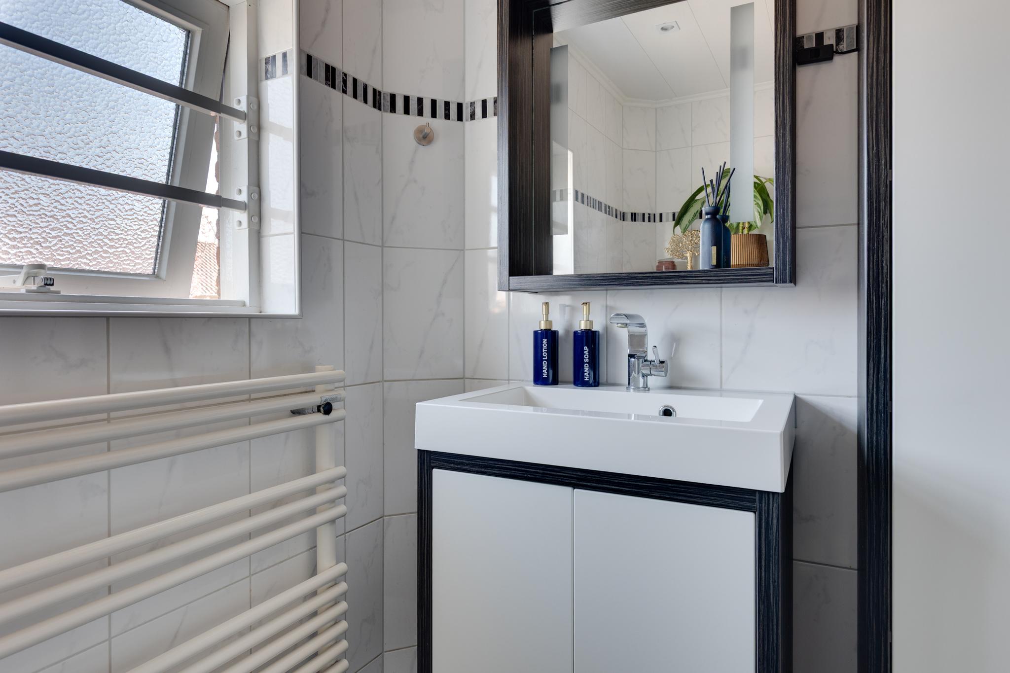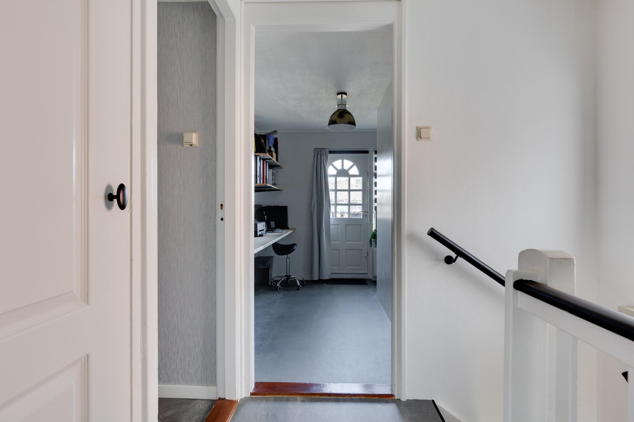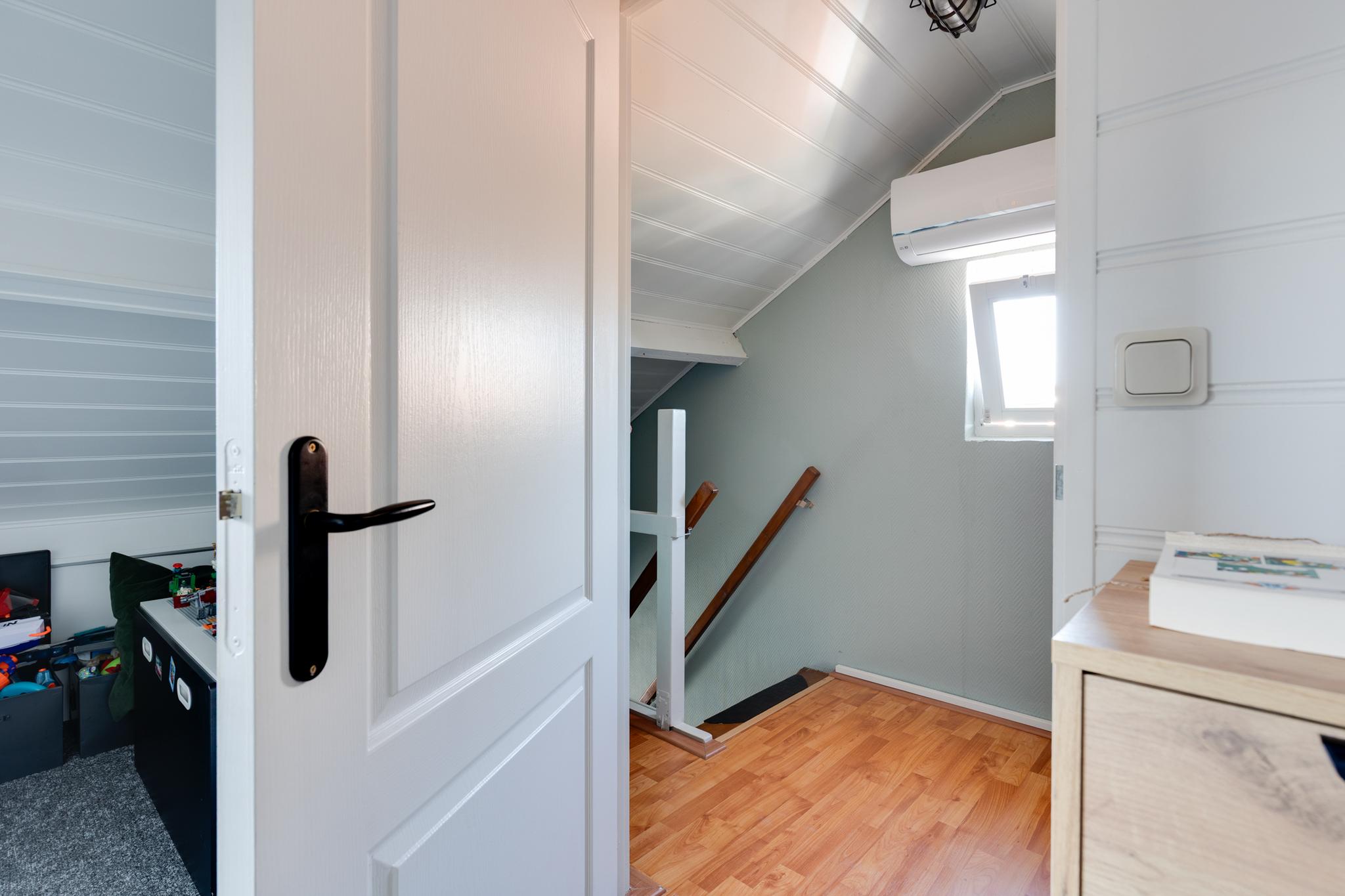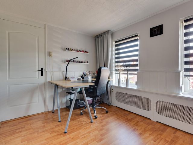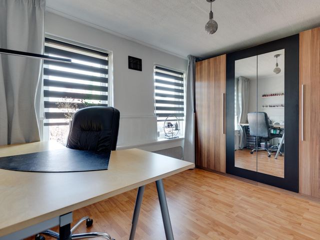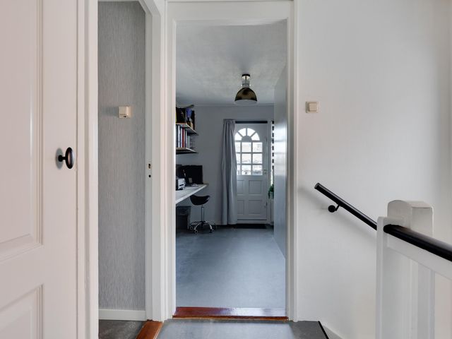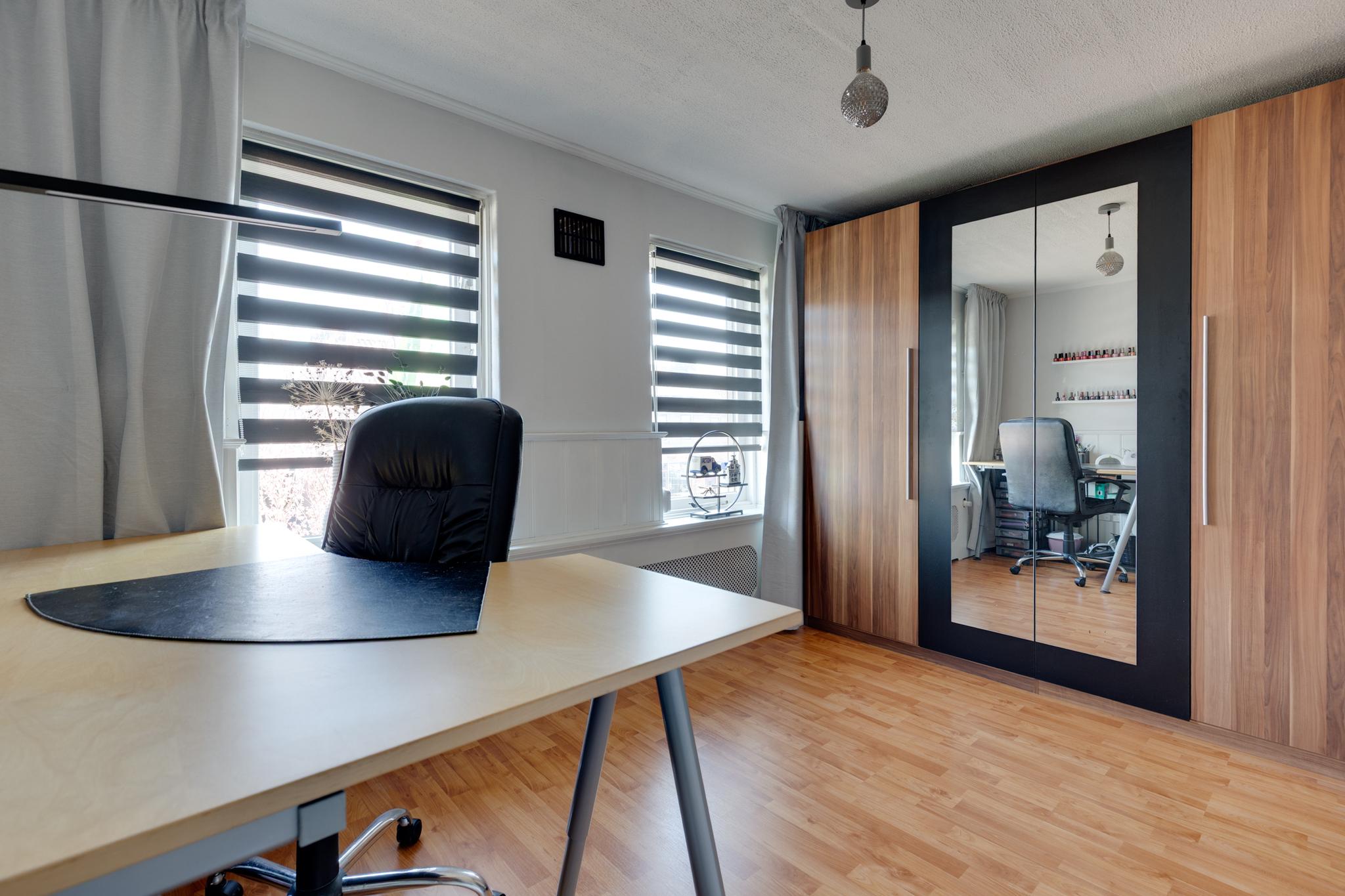 Overloop met inbouwkast en toegang tot de 3 slaapkamers en badkamer. De kleinste van de 3 slaapkamers op deze verdieping is thans in gebruik als kantoortje/werkkamer. Alle 3 slaapkamers zijn voorzien van een inbouwkast. De badkamer beschikt over een inloopdouche, wastafelmeubel, toilet en designradiator. De kantoorruimte/werkkamer biedt toegang tot het dakterras en beschikt ook over een vaste trap naar de tweede verdieping.