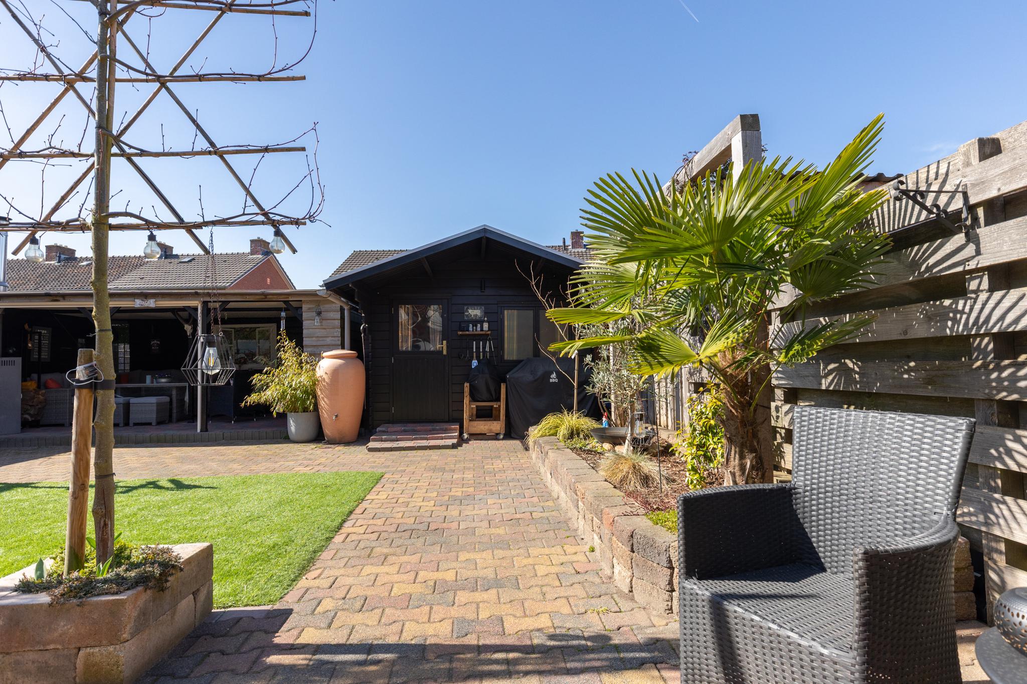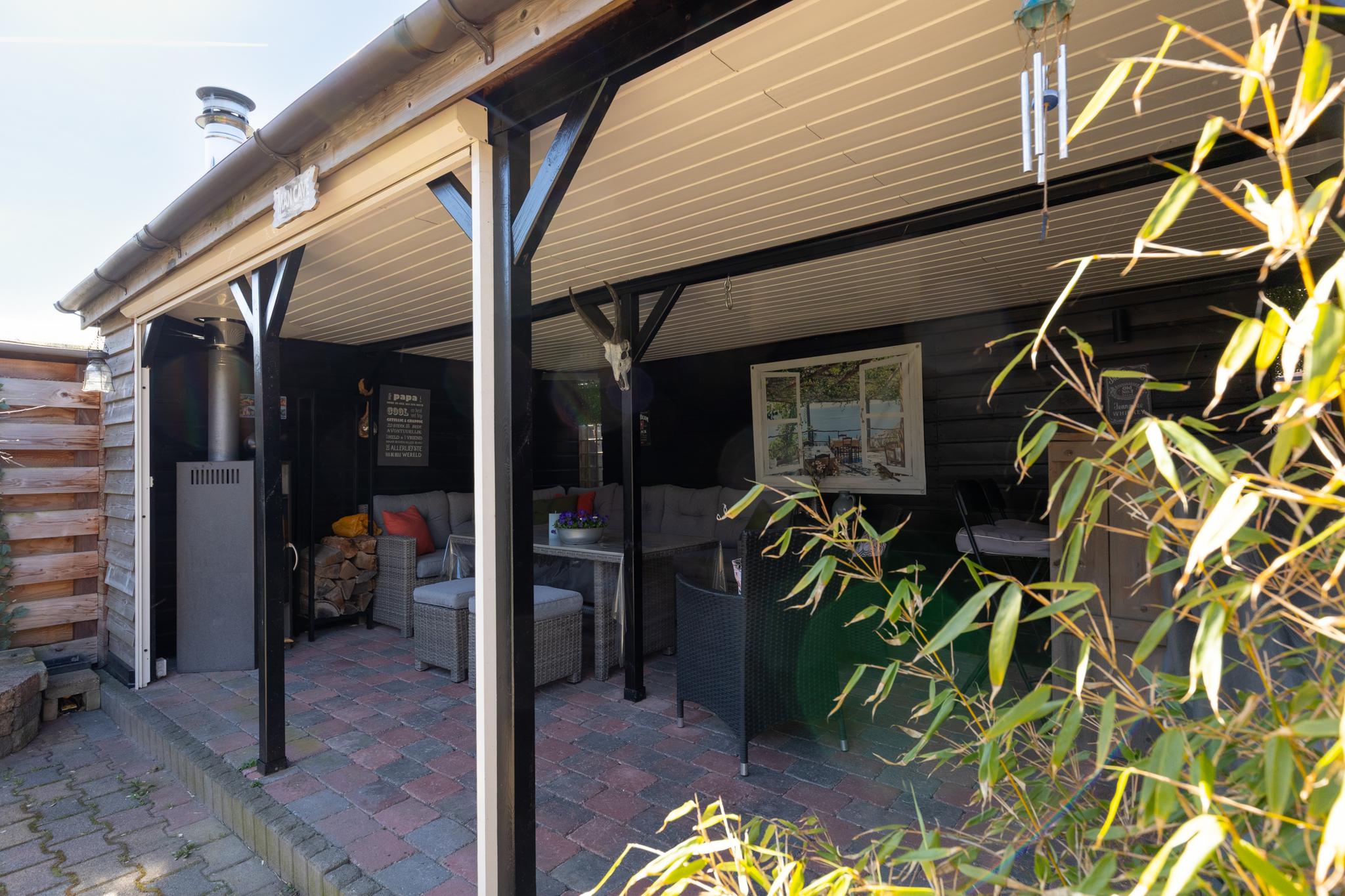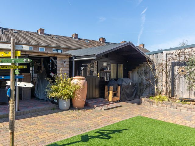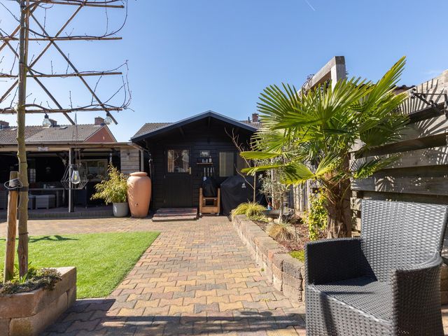 De tuin aan de achterzijde is gelegen op het zonnige zuid-westen. In de achtertuin bevinden zich een houten overkapping en een houten tuinhuisje. De houten overkapping is ingericht als fijne loungehoek en beschikt over een houtkachel welke ter overname is. De achtertuin is net als de voortuin onderhoudsvriendelijk aangelegd met sierbestrating en borders.