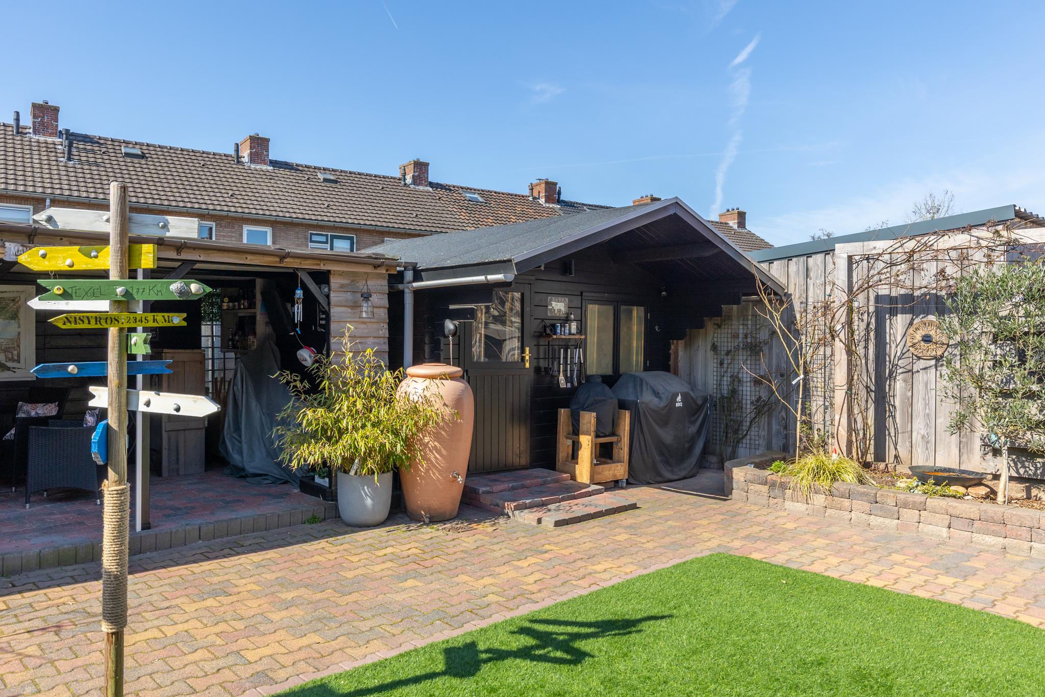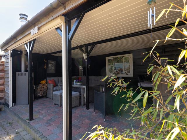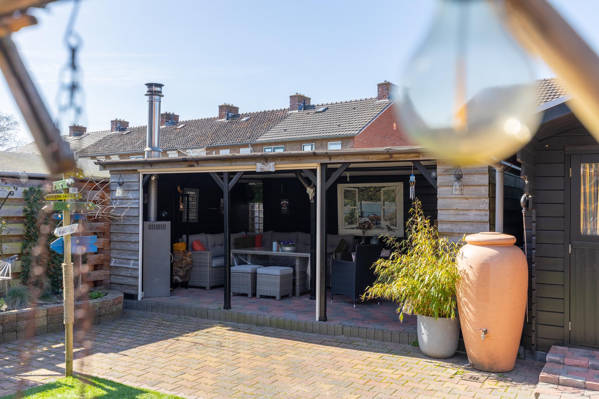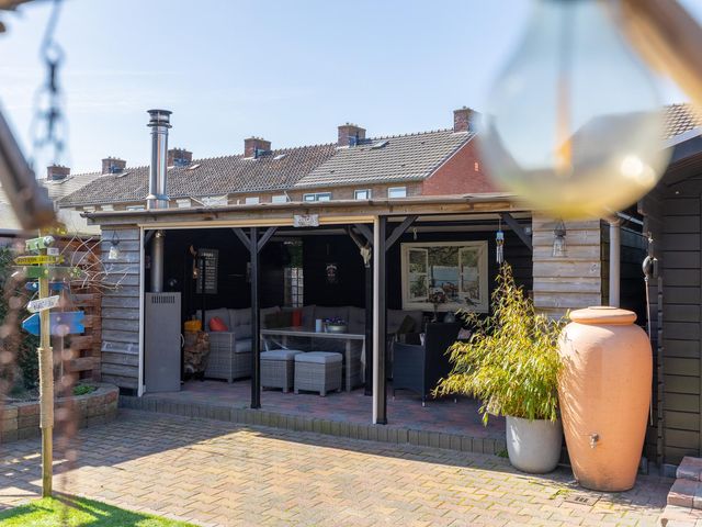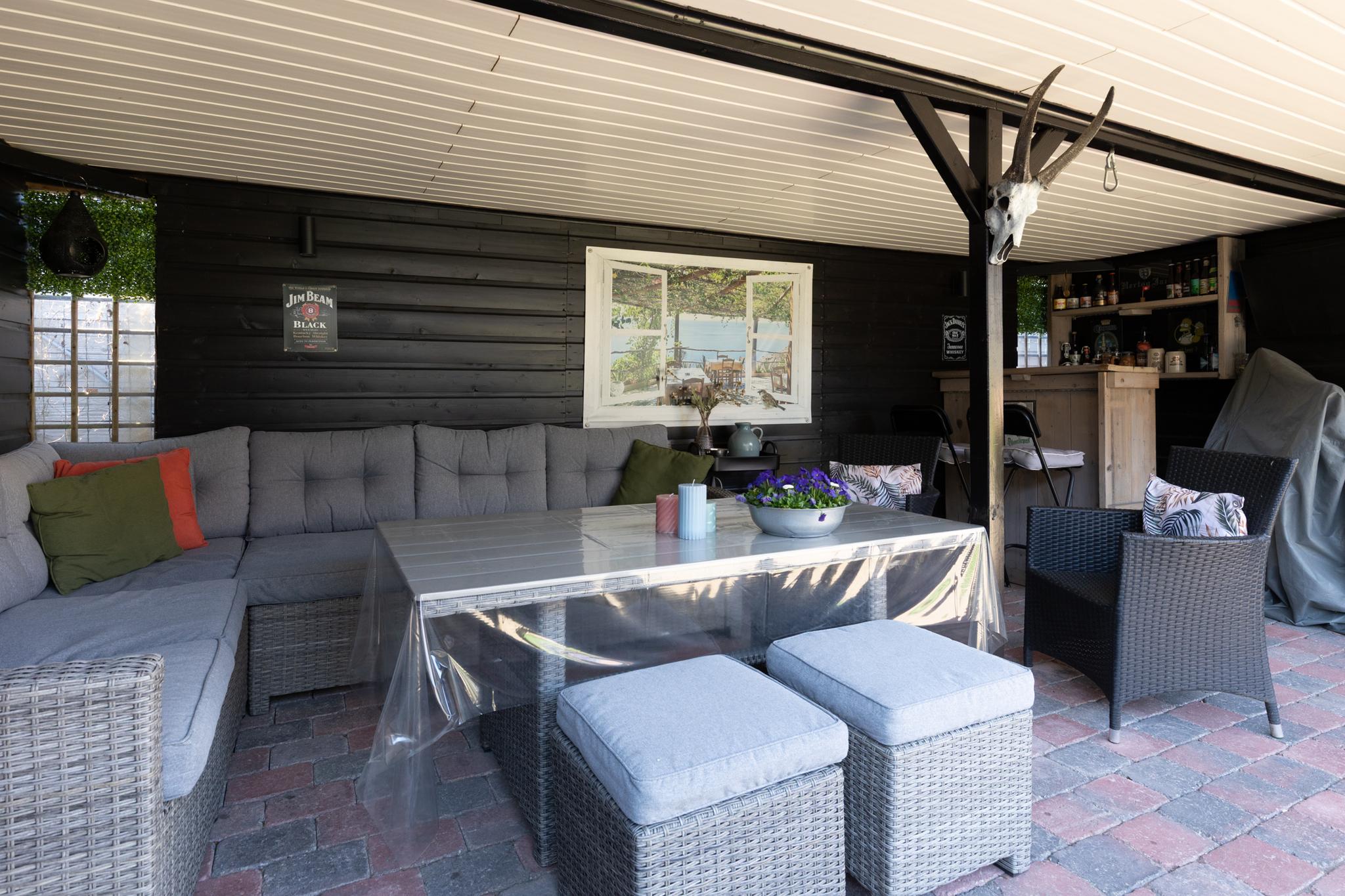 De tuin aan de achterzijde is gelegen op het zonnige zuid-westen. In de achtertuin bevinden zich een houten overkapping en een houten tuinhuisje. De houten overkapping is ingericht als fijne loungehoek en beschikt over een houtkachel welke ter overname is. De achtertuin is net als de voortuin onderhoudsvriendelijk aangelegd met sierbestrating en borders.